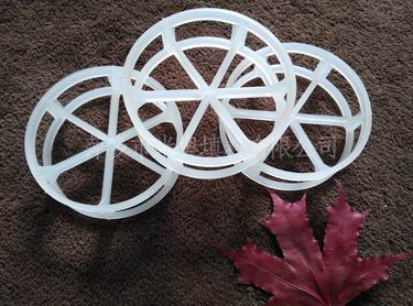 塑料扁環的高徑比為0.2-0.4,取消了階梯環的翻邊,采用內彎弧形筋片來提高填料強度,在亂堆時能有序排列,流道結構合理,壓降低,在處理能力和傳質性能上均有所改善。