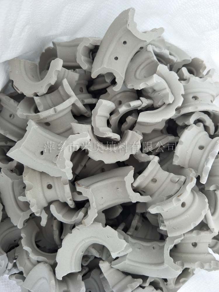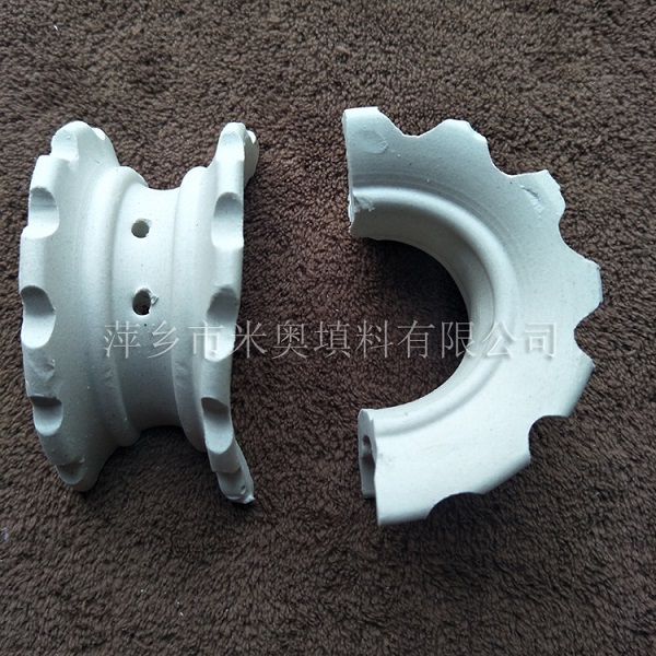 陶瓷異鞍環是在矩鞍環填料基礎上加以改進的新型填料,外觀上異鞍環將矩鞍填料的平滑弧形側面改為鋸齒形或波紋凸起的側面。這樣在填料床層內,增加了填料間接觸的空隙,使之更有利于氣體和液體在填料層中的流動和分散,具有壓降低,傳質效率高等特點。