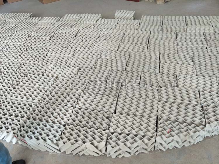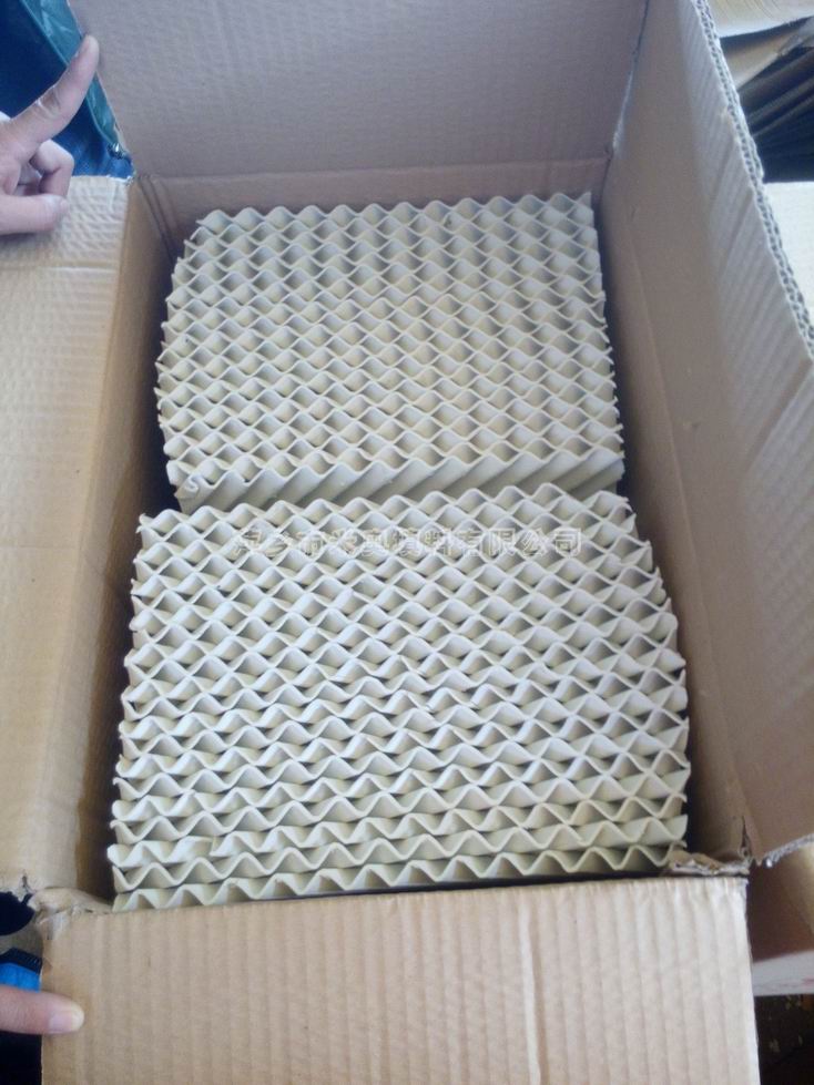 陶瓷規整波紋填料是一種新型規整填料,它是由許多具有相同幾何形狀的填料單元體組成。由于陶瓷獨特的結構,具有良好的親水性能,其表面可形成極薄的液膜的湍動及氣流的傾斜曲折通道能促進氣流但又不阻擋氣流使陶瓷填料能與金屬填料相匹敵,而其耐腐蝕、耐高溫性能金屬填料卻無法相比。表面結構有良好的濕潤性能,能使液體加快流動、使填料滯液量降至最低。從而降低了過熱、聚合和結焦的機會。