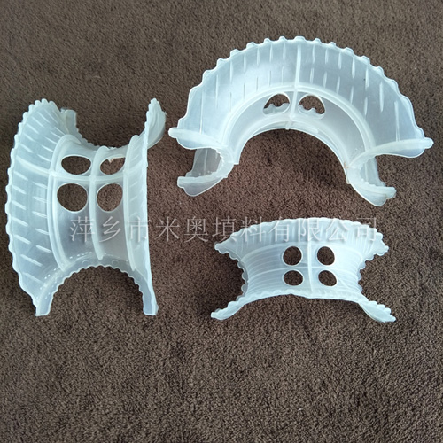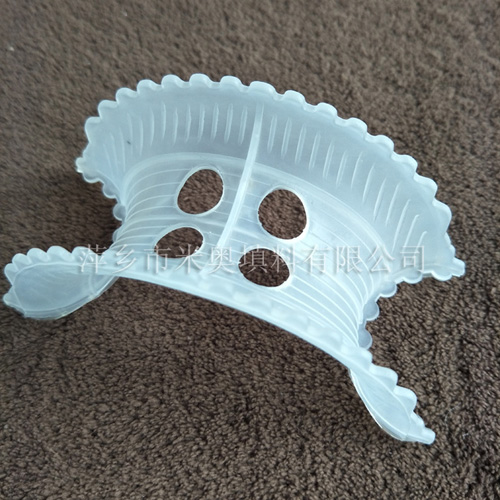 塑料異鞍環是20世紀70年代美國Noton公司對普通矩鞍環填料作出了改進,其特點是將扇形弧面改進成帶鋸齒邊緣的貝殼狀弧面,并在鞍背上增加了開孔,這樣填料層內的通道更加通暢,改善了液體分布性能,降低了氣體通過的阻力,提高了傳質性能。塑料異鞍環鞍形填料類似于馬鞍形狀,這種填料層中主要為弧形的液體通道,填料層內的空隙較環形填料(尤其較拉西環填料)更加連續。