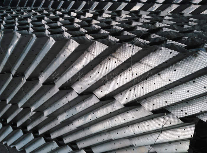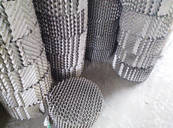 金屬波紋填料是用金屬薄板沖壓、拉伸成特定的壓延網片,表面成規則的菱形網孔、保持絲網波紋填料的幾何規則結構沖壓成波紋片,再組成盤狀波紋規整填料。網孔波紋填料傳質規律接近絲網波紋填料,每米填料的理論板數高于孔板波紋填料。由于網板可用各種金屬材料加工,選材面較絲網填料廣,因而耐腐蝕性能好。 規格參數: |